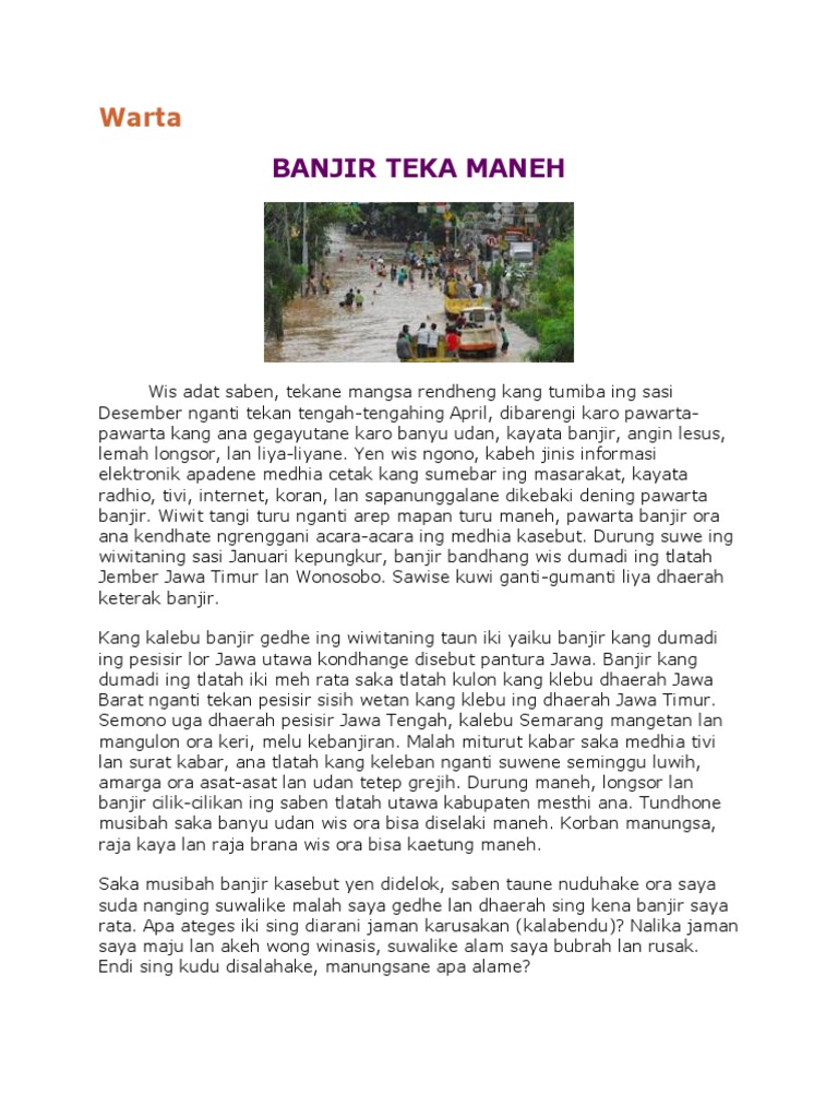 Contoh Warta Sunda Masnurul from id-static.z-dn.net Banjir jakarta hujan deras terus guyur jabodetabek hingga 7. Ulasan tentang contoh berita bahasa sunda tentang banjir. Contoh warta bahasa sunda tentang gempa bumi dan gunung meletus. Untuk yang lainya akan diupdate dilain kesempatan, terimakasih atas waktunya. 8 warta tentang bencana alam, longsor, gempa, dan banjir bahasa sunda; Contoh pidato perpisahan sekolah dalam bahasa sunda beserta artinya. Di bawah ini adalah contoh warta dalam bahasa sunda tentang bencana alam : Berita bahasa sunda singkat 5w1h gue viral.