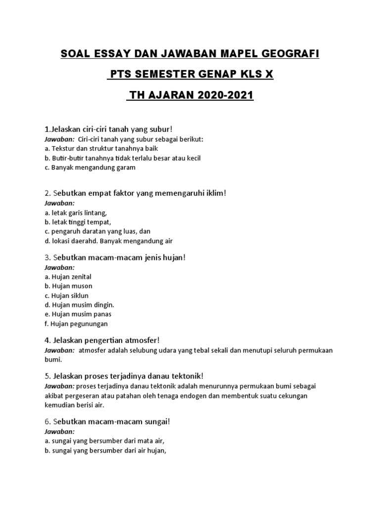 Soal 1 prakarya dan kewirausahaan kelas 10 semester 2. Qualities and characteristics of a good citizen essays. Ukbm geografi kelas 10 semester 2. Contohnya gunung mauna loa dan kilanca di hawai. Contoh soal geografi kelas 10 semester 1 dan semester 2 kurikulum 2013 untuk kisi kisi latihan soal uas mid semester berupa soal pilihan ganda dan essay semua bab 1, 2, 3, 4, 5, 6, 7 dst beserta kunci jawabannya dan pembahasannya lengkap. Bahan lavanya bersifat cair sekali. Kisi kisi soal uas geografi kelas x semester ganjil 2012/2013 sma negeri 3 lumajang education. Ulangan kenaikan kelas (ukk) adalah kegiatan yang dilakukan oleh pendidik di akhir semester genap untuk mengukur pencapaian kompetensi peserta didik di akhir semester genap pada satuan berikut ini contoh soal ukk geografi kelas 10 kurikulum 2013. Memenuhi fungsi sebagai karya seni c. 0 ratings0% found this document useful (0 votes). Mla format on essay writing. Kebakaran hutan yang terjadi di pulau sumatera menyebabkan berbagai permasalahan seperti gangguan pernafasan dan jarak pandang yang terbatas bagi penduduk. Berikut bospedia memberikan soal essay geografi kelas 10 sma/ma.